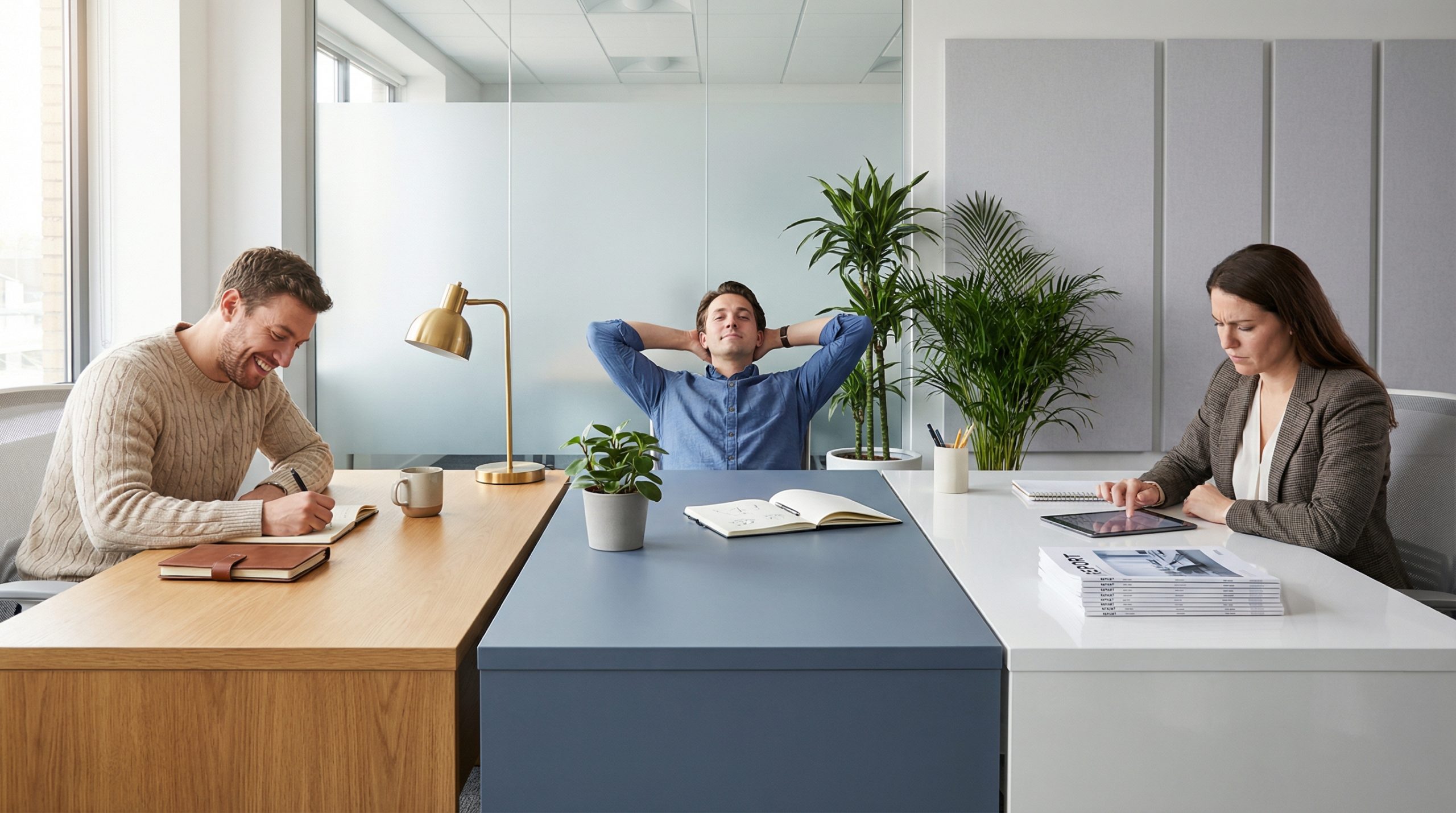 - محیطهای خلاقانه (آژانسهای تبلیغاتی، استارتاپها): در این فضاها، استفاده از میزهایی با رنگ پایه خنثی مانند سفید یا چوب روشن، به کارکنان اجازه میدهد تا با استفاده از وسایل شخصی، فضای خود را رنگارنگ و خلاقانه کنند.